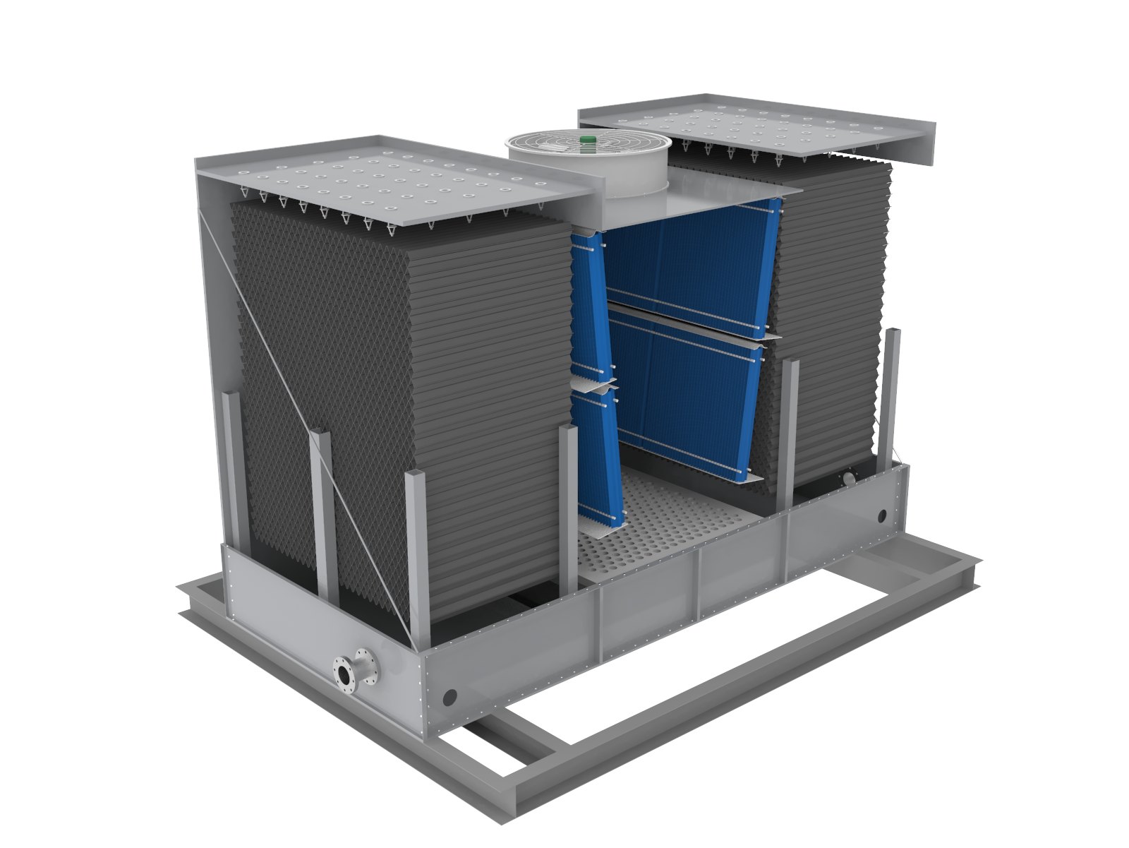 Forced Draft (V-Flow) Closed Circuit Cooling Tower Forced Draft V-Flow Closed Circuit Cooling Tower by explaining each part of its name and how it works. V-Flow (or Vertical Flow): This describes the path of the spray water (the separate, external water loop) and air. The spray water is pumped to the top and...